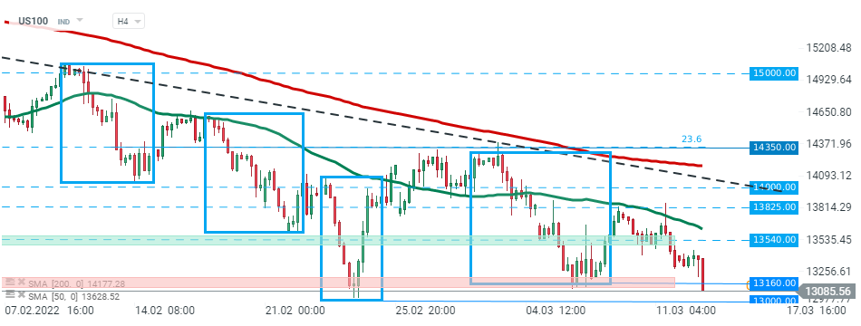 Indeks US100 zanotował spadek po ogłoszeniu komunikatu Białego Domu. Indeks zmierza obecnie w kierunku ważnego wsparcia w okolicach 13000 pkt, które wyznacza dolne ograniczenie struktury 1:1 oraz minima z lutego 2022. Jeśli dojdzie do jego przełamania, korekta spadkowa może się pogłębić. Źródło: xStation5
