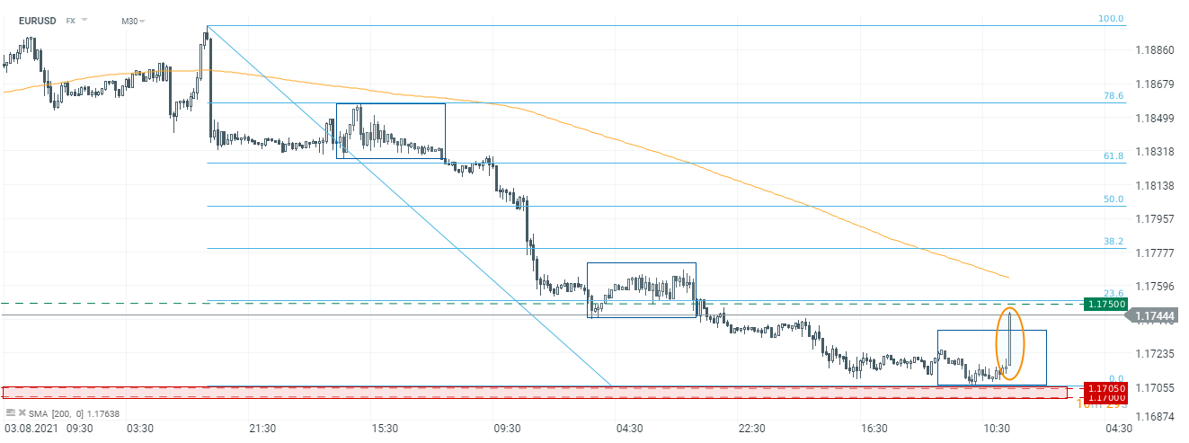 EURUSD odbija z okolic 1,1705 i zbliża się do 1,1750 - w pobliżu tego poziomu przebiega zniesienie Fibo 23,6% niedawnego ruchu spadkowego. Źródło: xStation5
