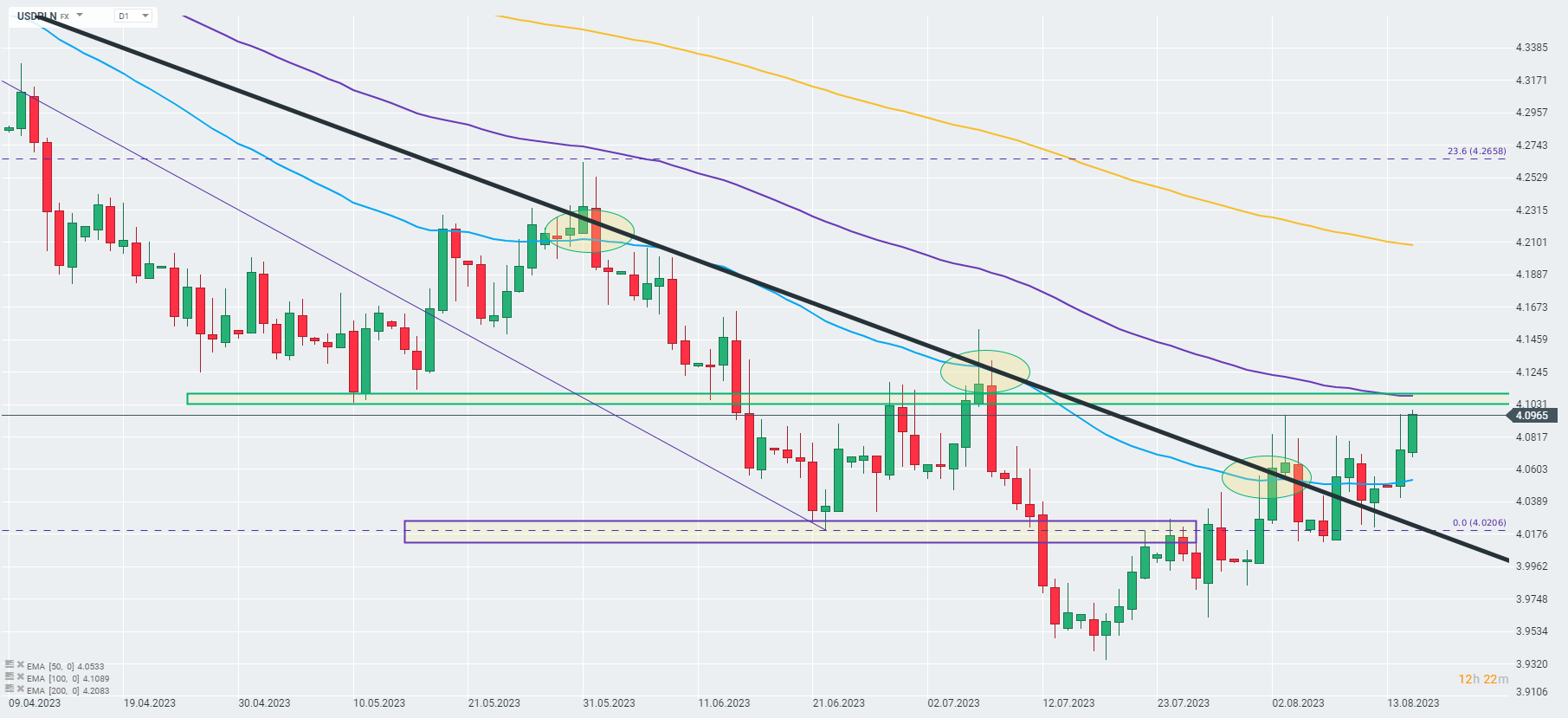 Para USDPLN zyskuje dzisiaj blisko 0,55% i notowana jest w bliskiej strefie bariery 4.10. Szerokorynkowa słabość polskiego złotego wynika dzisiaj przede wszystkim z wyprzedaży na rynkach akcyjnych w Europie oraz narastających przewidywań dotyczących możliwych obniżek stóp procentowych w Polsce. Wczoraj wiele banków zrewidowało swoje prognozy dotyczące wskazań inflacyjnych za sierpień, które mają się znaleźć blisko strefy 10%, która uważana jest za poziom, który może zachęcić NBP do rozpoczęcia cyklu cięć.