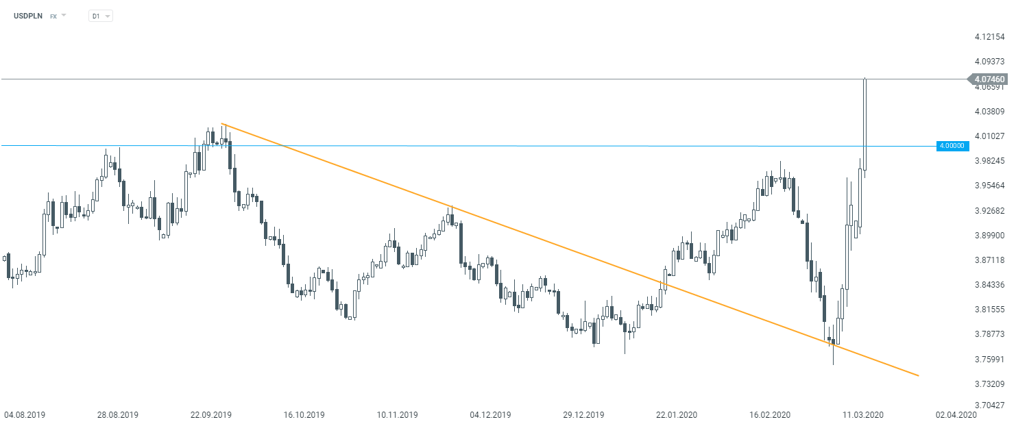 Polski złoty wyraźnie traci w ostatnich dniach, co ma związek z niepokojami panującymi na światowym rynku akcji, ale także z wczorajszą decyzją NBP. Narodowy Bank Polski zdecydował się między innymi na zakup obligacji Skarbu Państwa na rynku wtórnym. We wtorek kurs USDPLN znalazł się powyżej poziomu 4 złotych i 7 groszy, co oznacza najwyższe poziomy od marca 2017 roku. Zloty traci do USD ponad 2,4%. Przecenę obserwujemy także w stosunku do euro (1,05%), funta (-0,95%) i franka (-1,3%).