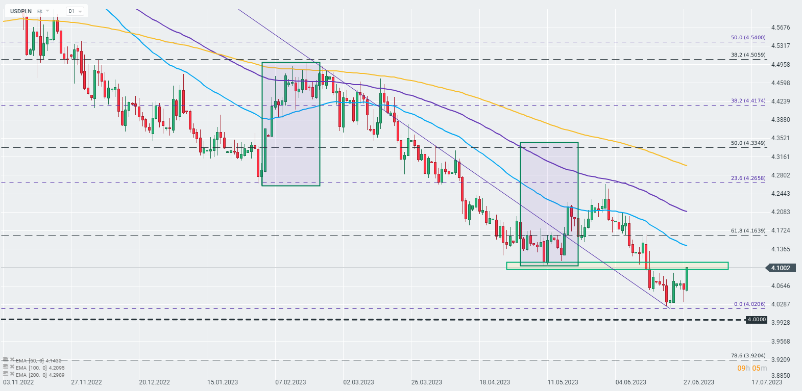 Notowania pary USDPLN wybijają się powyżej bariery 4,1. Źródło: xStation 5