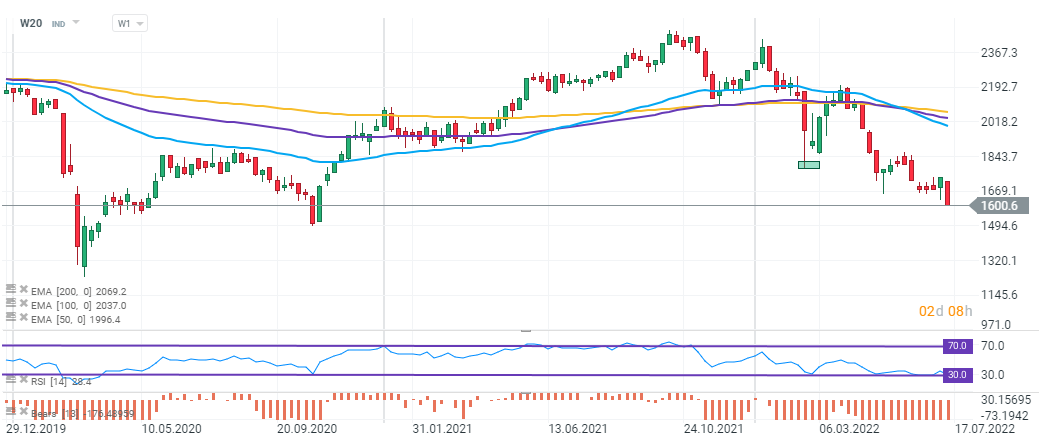 Słabość polskich banków oraz pogarszające się sentymenty na rynkach globalnych sprowadzają notowania polskiego benchmarku blue chipów na poziomy niewidziane od 2020 roku. Słabość spółek z sektora bankowego spowodowana jest m.in. informacją o podpisaniu przez Prezydenta ustawy wprowadzającej wakacje kredytowe i reformie WIBORu.