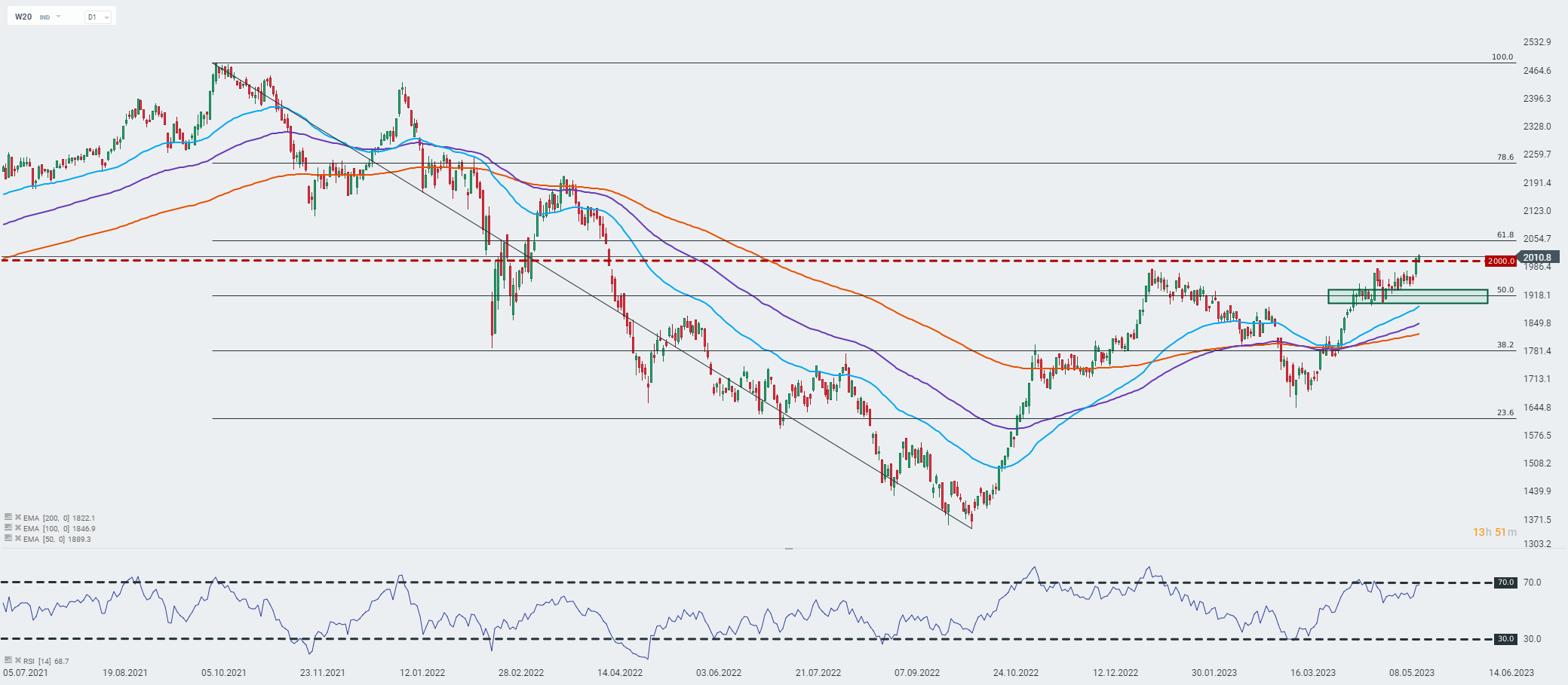 Początek sesji w nowym tygodniu jest wyjątkowy dobry dla polskiego benchmarku WIG20 (W20), który wybił się powyżej psychologiczną barierę 2000 punktów.