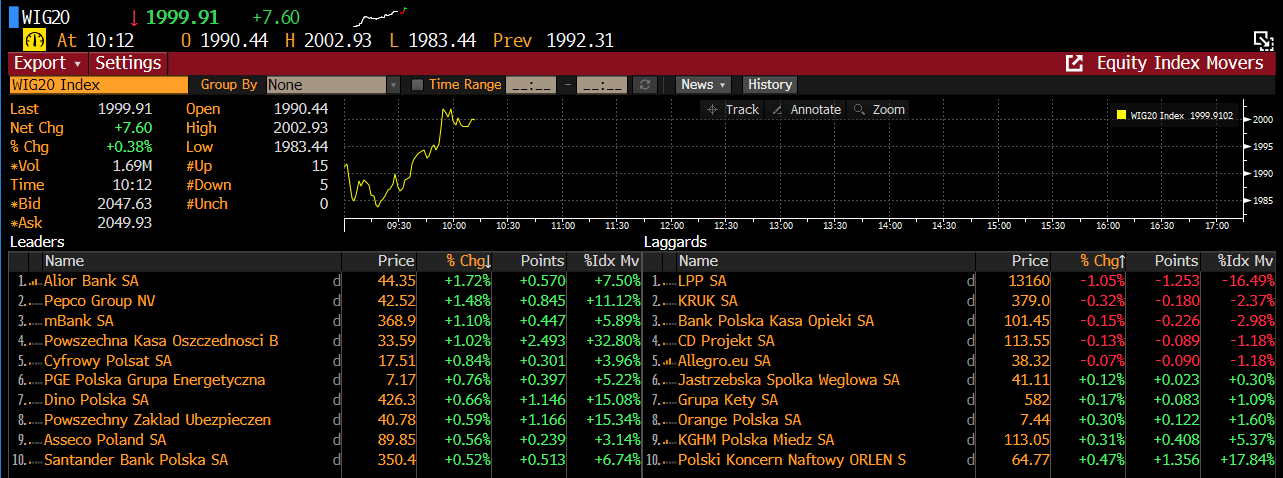 Notowania podczas dzisiejszej sesji ciągną w górę przede wszystkim akcje Alior Banku oraz Pepco Group. Źródło: Bloomberg