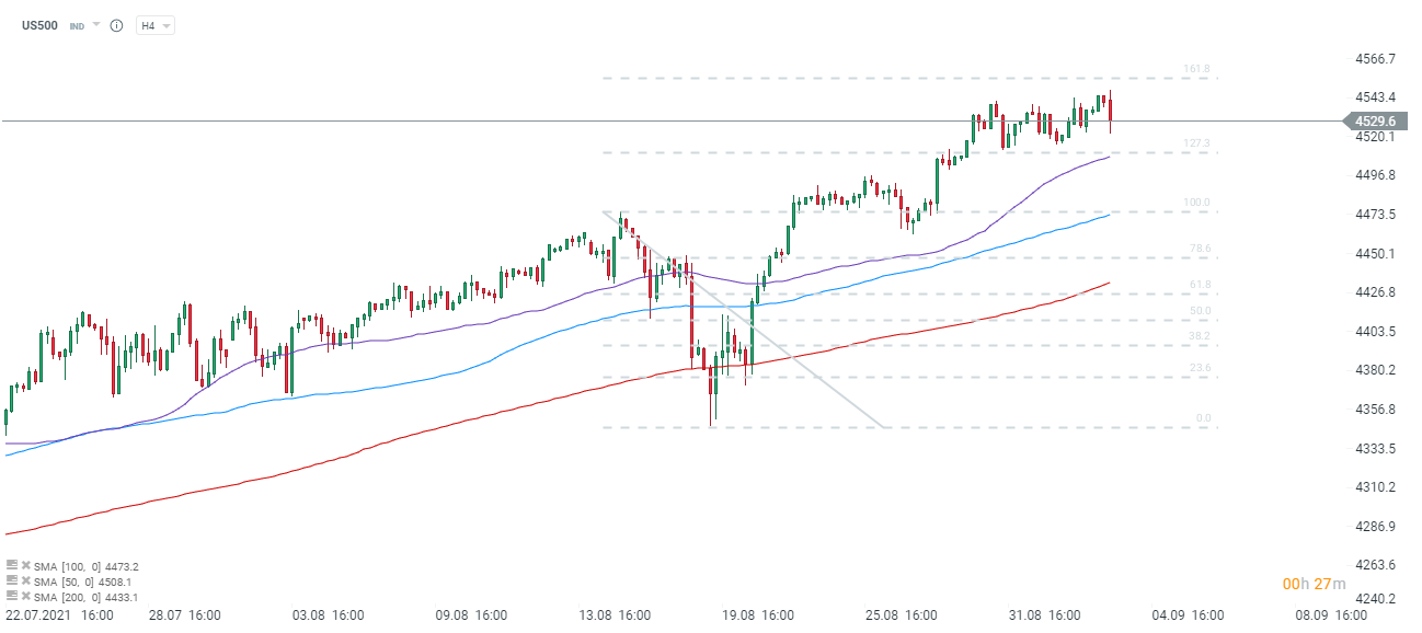 US500 wyraźnie traci, cżęść ruchu miałą miejsce w ostatnich minutach. Źródło: xStation5