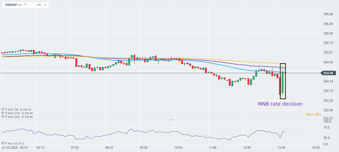 Bank centralny Węgier zdecydował się obciąć stopy procentowe o 50 punktów bazowych do 7.25%, Decyzja była zgodna z oczekiwaniami i przyniosła niewielką reakcję na parze USDHUF.