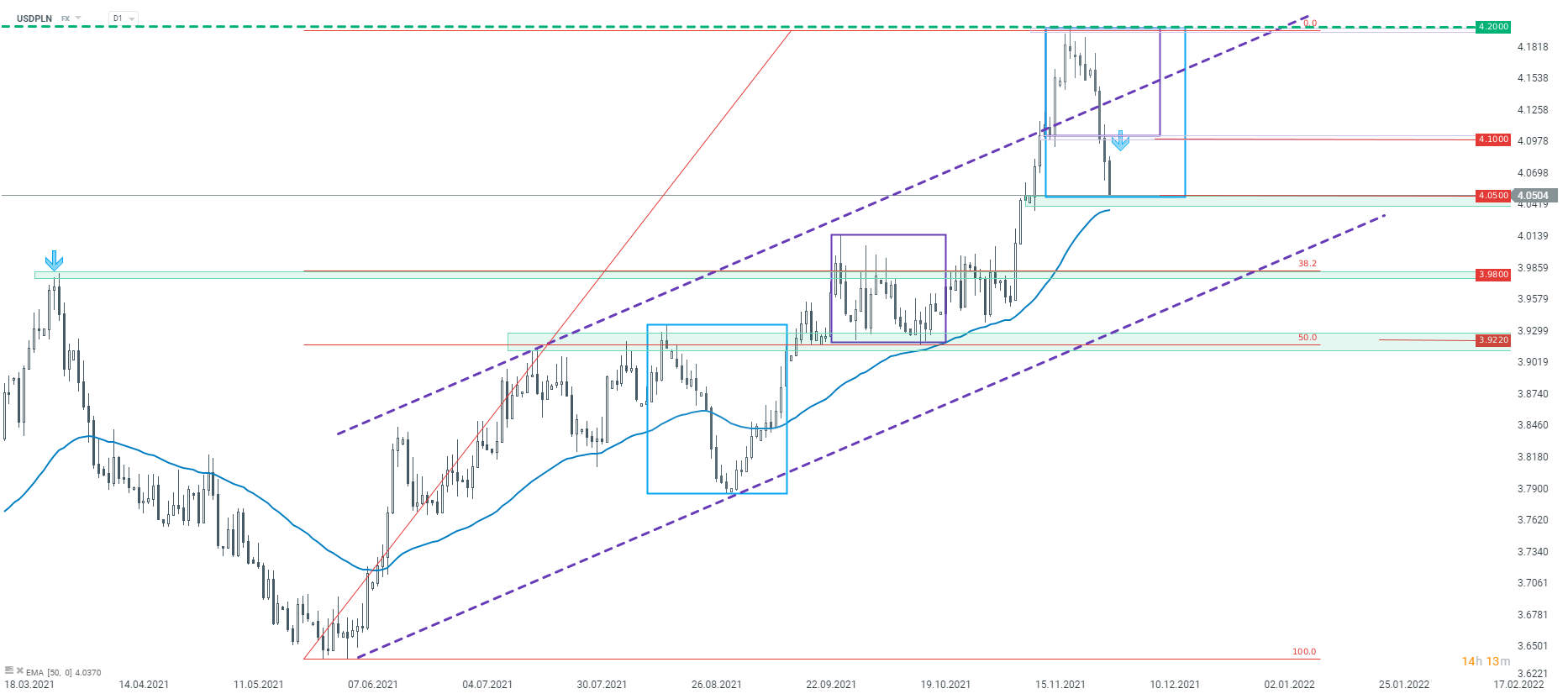 Notowania USDPLN pokonały wczoraj krótkoterminowe wsparcie przy 4,10 zł (o czym wspominaliśmy w porannym webinarium), co przełożyło się na pogłębienie korekty spadkowej. Aktualnie kurs testuje kolejne ważne wsparcie -4,05 zł, które wynika z układu największej korekty (niebieskie prostokąty). Zgodnie z metodologią Overbalance, obrona tego poziomu może przełożyć się na wygenerowanie kolejnej fali wzrostowej. Z drugiej strony, negacja układu powinna doprowadzić do pogłębienia spadków w kierunku dolnego ograniczenia kanału wzrostowego - okolice 3,96-3,98 zł.