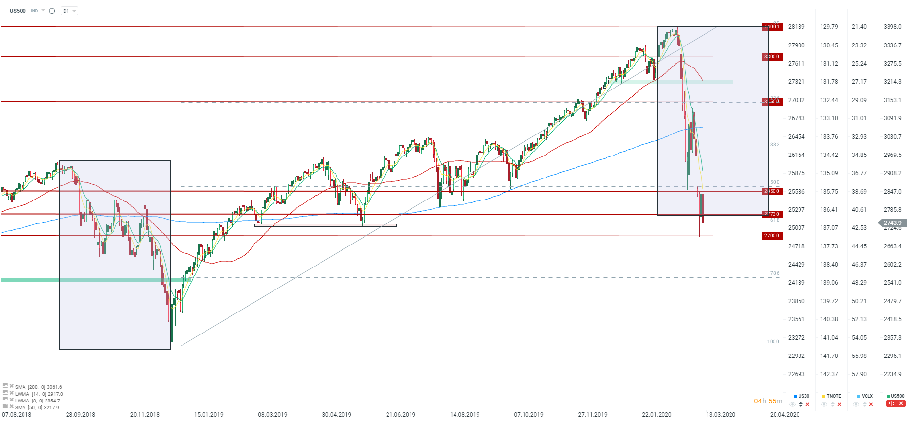 Światowa Organizacja Zdrowia z dniem dzisiejszym ogłasza pandemię nowego koronawirusa. Do tej pory WHO wstrzymywało się z tą decyzją, ale ze względu na szybkie rozprzestrzenianie się wirusa oraz brak odpowiednich działań, obecna sytuacja może być nazywana pandemią. Obecnie na całym świecie zachorowało ok. 125 tys. osób, z czego połowę udało się wyleczyć, a 4,5 tys. osób zmarło. Tylko dzisiaj mamy do czynienia z 6 tys. nowych przypadków, głównie w Europie, co jest rekordem ilości nowych zachorowań poza Chinami. Wall Street reaguje wyraźnymi spadkami i traci dzisiaj 4,5%. Cofa się również złoto oraz ropa naftowa.