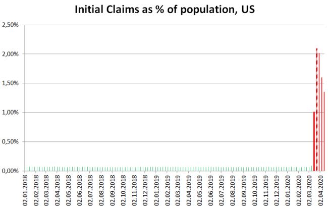 Ilość wstępnych wniosków pokazuje kolejny silny odczyt, choć widać, że jednocześnie spada ich liczba względem tydzień do tygodnia. Niemniej ilość nowych bezrobotnych w USA może zwiększyć się w najbliższym czasie o ponad 20 mln. Źródło: Macrobond, XTB