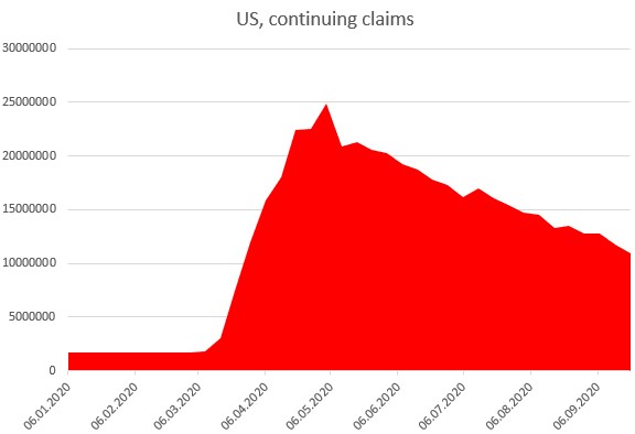 Lepiej wypada liczba bezrobotnych kontynuujących pobieranie zasiłku (continuing jobless claims), która wyniosła 10 976 tys. (oczekiwania: 11 400 tys.). W tym przypadku wcześniejsze dane również zostały zrewidowane do góry.