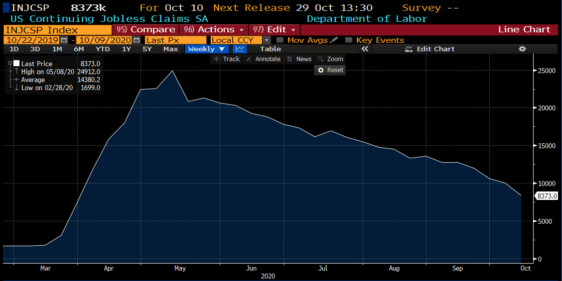 Continuing jobless claims po raz pierwszy w trakcie obecnego kryzysu spadają poniżej bariery 10 mln. Rekordowy odczyt z maja sięgnął niemal 25 mln bezrobotnych. Źródło: Bloomberg