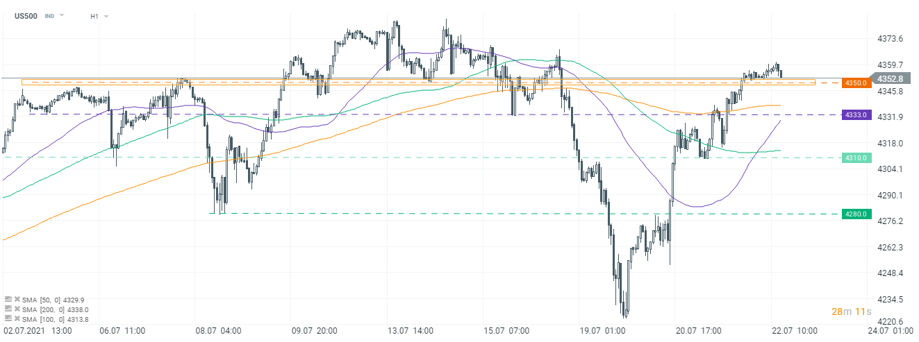 Tymczasem kontrakty futures na amerykańskie indeksy sugerują dodatnie otwarcie tamtejszej sesji kasowej. US500 zdołał już powrócić powyżej poziomu 4350 punktów, który może obecnie pełnić rolę pierwszego wsparcia. Reakcja rynku po "claimsach" jest lekko negatywna. Indeks zbliżył się do wspomnianego wsparcia.