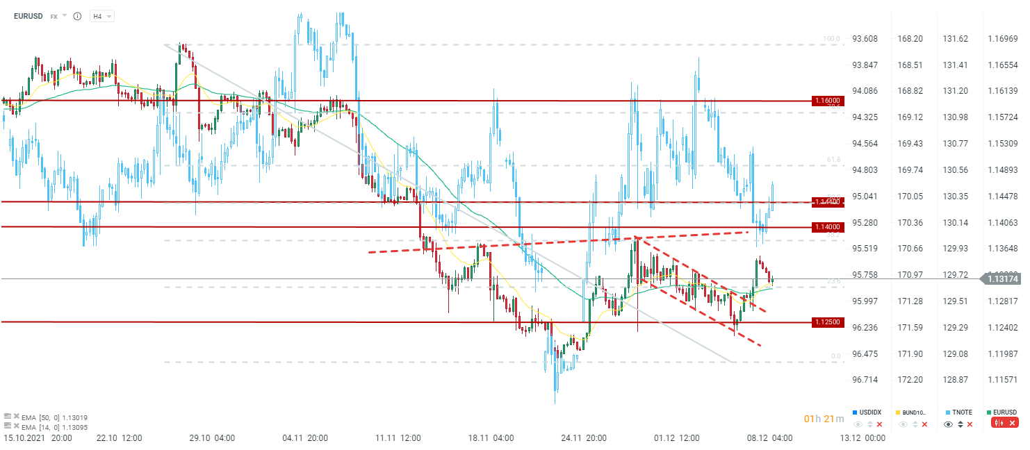 EURUSD nie reaguje jakoś znacząco. Obserwujemy minimalne cofnięcie na obecnej świecy H4. Co ciekawe, TNOTE utrzymują relatywnie wysokie poziomy, pomimo tak świetnych odczytów. Źródło: xStation5