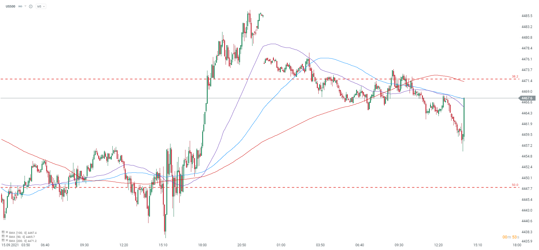 US500 wyraźnie odbija, dolar z kolei się umacnia. Te ruchy to jednak prawdopodobnie efekt danych o sprzedaży detalicznej. Źródło: xStation5