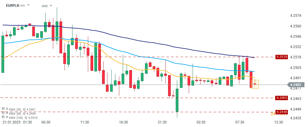 Na rynku walutowym nie widać znacznych ruchów po danych. Złoty w pierwszej reakcji lekko stracił w stosunku do euro, jednak szybko nadrobił straty i obecnie kontynuuje trend lekkiego umacniania. Źródło: xStation