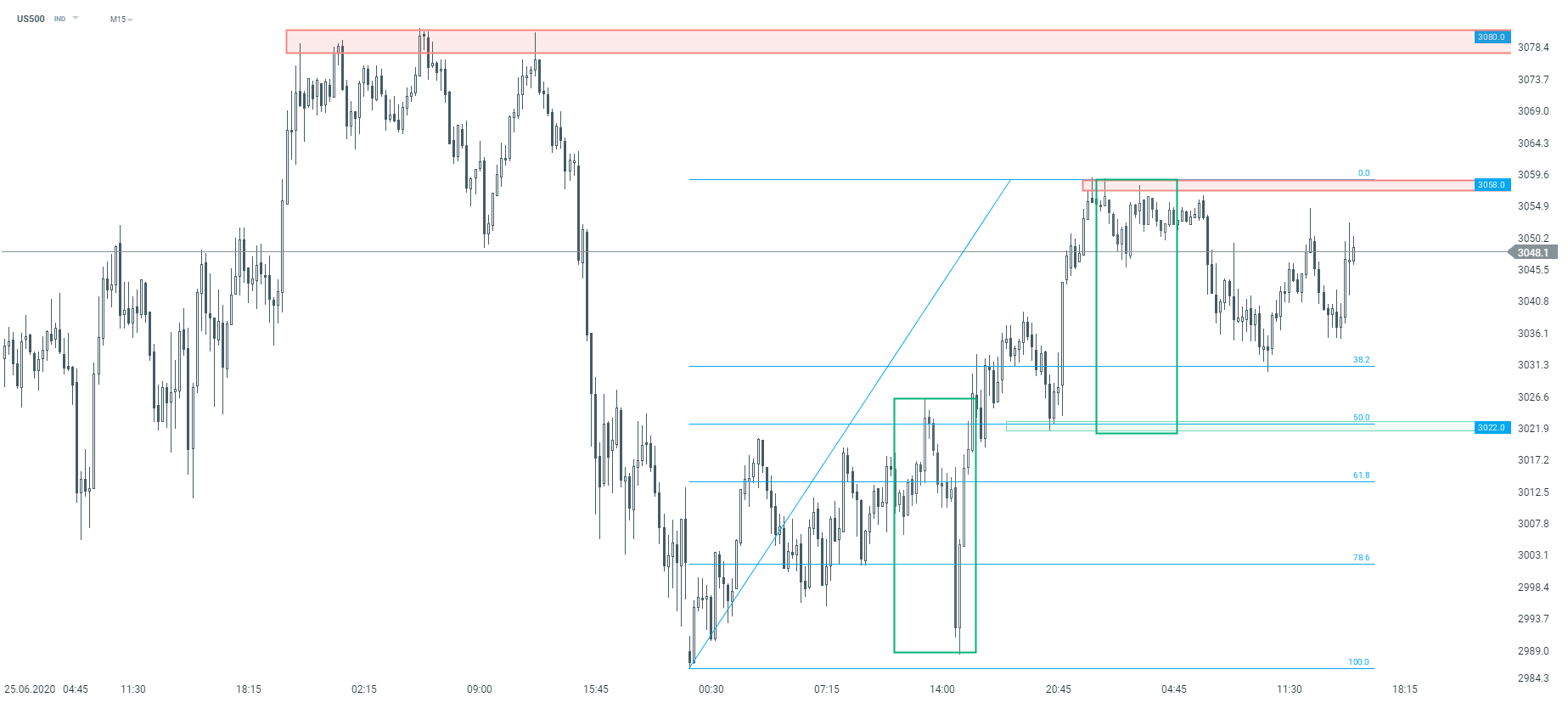Tuż rozpoczęciu sesji w USA, amerykańskie indeksy ruszyły w górę, z kolei zaraz po publikacji wskaźnika Conference Board kierunek wzrostowy jest utrzymywany. Jeżeli dojdzie do wybicia szczytów z godzin nocnych, kolejne ważne miejsce znajduje się przy 3080 pkt. Z kolei wsparcie znajduje się przy poziomie 3022 pkt, gdzie wypada dolne ograniczenie układu 1:1 oraz mierzenie 50% Fibo.