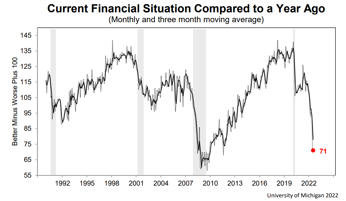 Wg raportu UoM, "Konsumenci są zgodni co do szkodliwego wpływu wzrostu cen na ich finanse osobiste. Odsetek konsumentów obwiniających inflację o obniżenie standardu życia nadal wzrastał i wyniósł 49%, osiągając najwyższy poziom w czasie Wielkiej Recesji. Te negatywne opinie utrzymały się w obliczu niedawnego spadku cen benzyny na stacjach benzynowych."