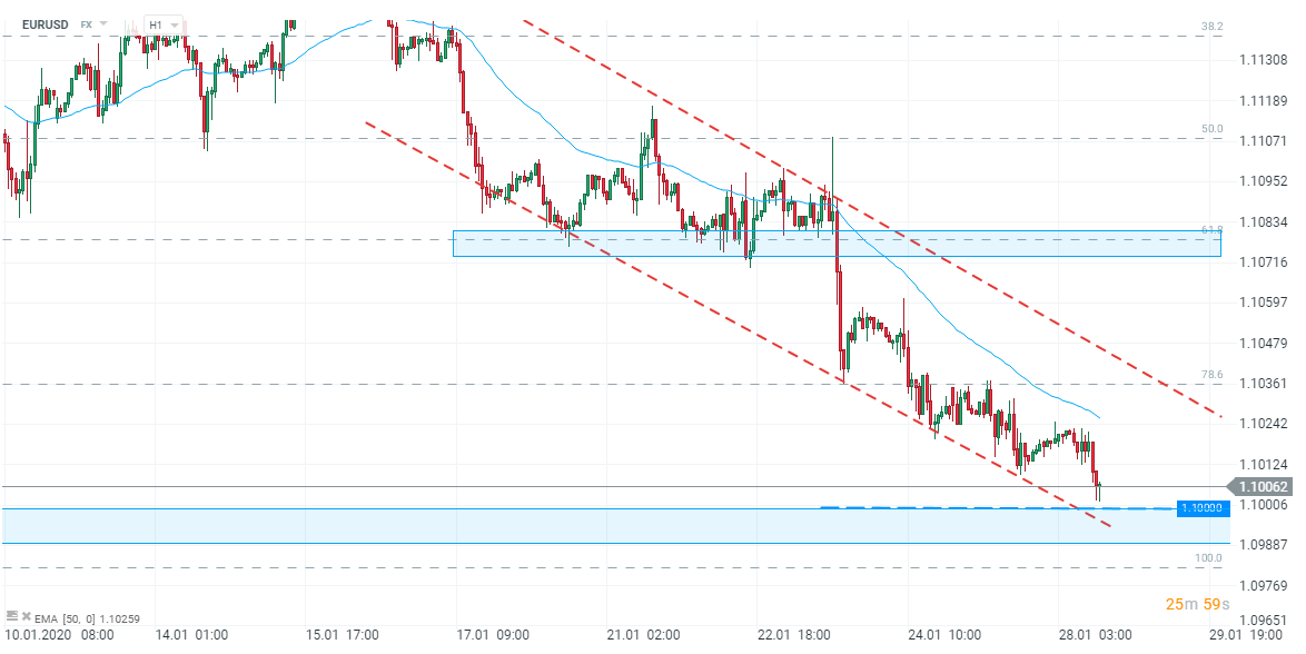 Aktualnie kurs EURUSD znajduje się na granicy kluczowego wsparcia dla ceny - pułap 1,10. Wydaje się jednak, że gorszy niż przewidywano wskaźnik bazowy ogranicza aktualne wzrosty dolara, gdyż rynek nie zareagował podwyższoną zmiennością na informacje . Źródło: xStation5