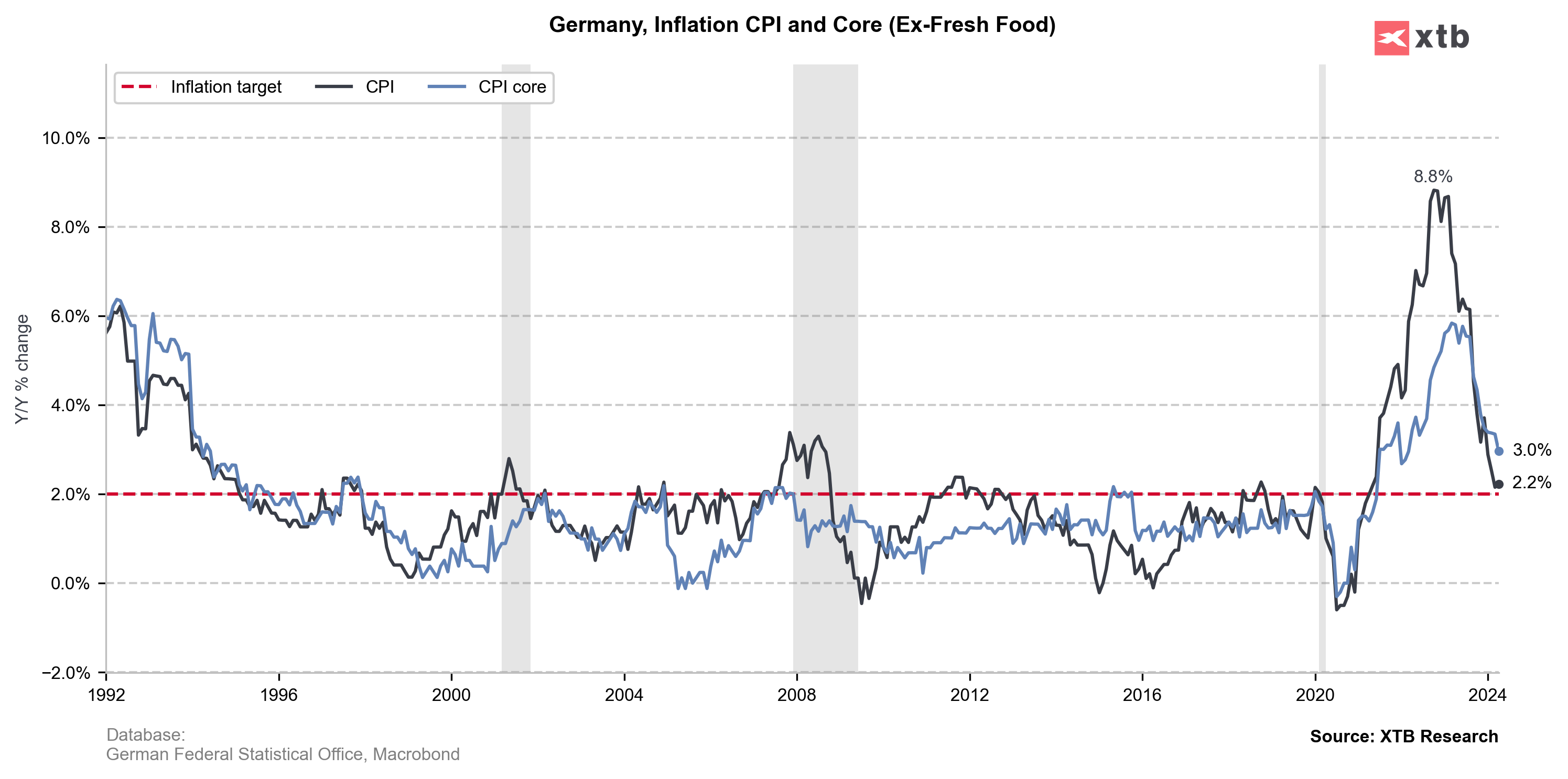 Wstępne dane za kwiecień odnośnie CPI okazały się w Niemczech lekko niższe niż oczekiwano. Na wartość 2,2% CPI najmocniej wpłynęły usługi, dla których inflacja w kwietniu wyniosła 3,4% (-0,3 p.p. w stosunku do poprzedniego miesiąca). W segmencie dóbr ceny wzrosły o 1,2%. Ceny energi spadły za to o -1,2%.