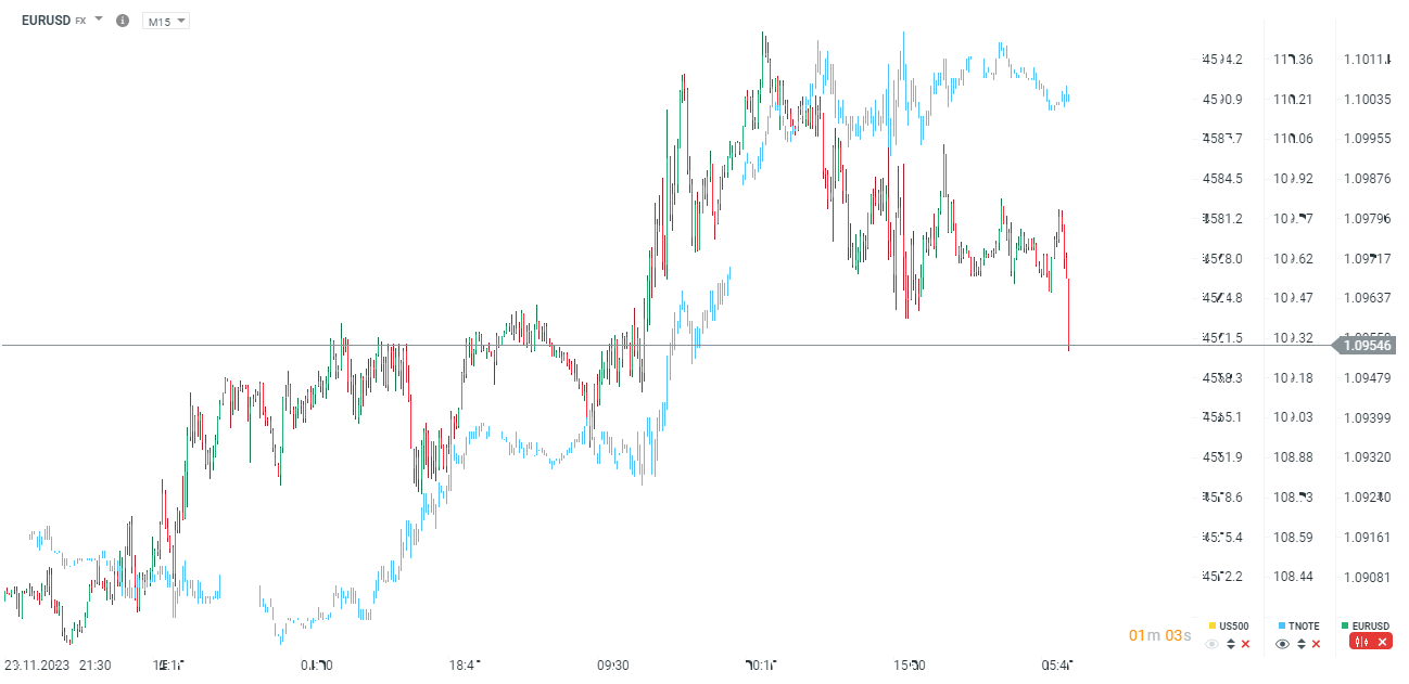 Jednocześnie jednak nie widać spadków na TNOTE (wzrostu rentowności), ale za to bardzo wyraźnie zyskuje indeks dolara. Można zatem wskazać, że po części jest to ruch na euro, ale przede wszystkim na dolarze. W zestawieniu wszystkich par walutowych związanych z EUR i USD, EUR w dużej mierze traci, a dolar zyskuje.