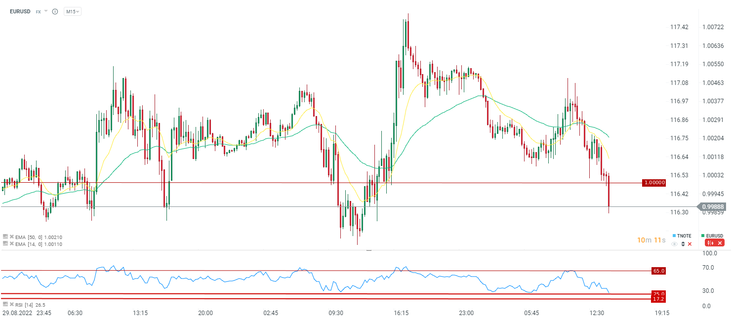 EURUSD spada ponownie poniżej parytetu po danych, które dają otwartą drogę do mocniejszych podwyżek ze strony Fed. Źródło: xStation5