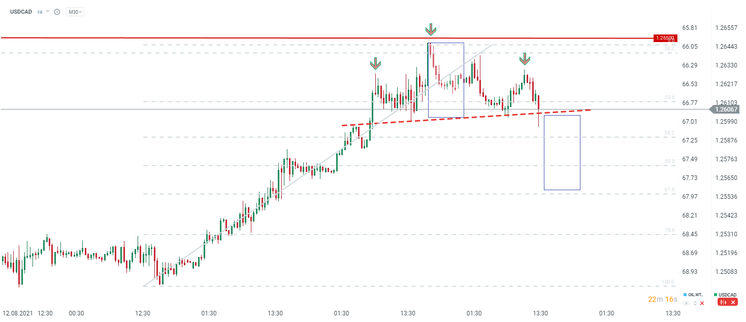 Dosyć mocna reakcja na CAD. Niemniej też szybko para powraca powyżej linii trendu optencjalnej formacji RGR oraz powyżej poziomu 1,2600. Ważne jednak dla sprzedających jest utrzymanie pary poniżej zniesienia 23.6. Źródło: xStation5
