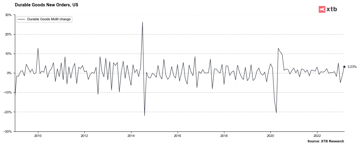 Zamówienia na dobra trwałe nieoczekiwanie wzrosły wobec prognoz większej dynamiki spadkowej. Patrząc na recesje od 2000 roku, za każdym razem obserwowany był ich szerszy spadek. Źródło: XTB Research