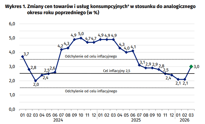 Inflacja w Polsce za marzec okazała się mniejsza od oczekiwań rynku, jednak wciąż wzrosła zauważalnie i po raz pierwszy od 4 miesięcy znalazła się powyżej celu inflacyjnego NBP.
