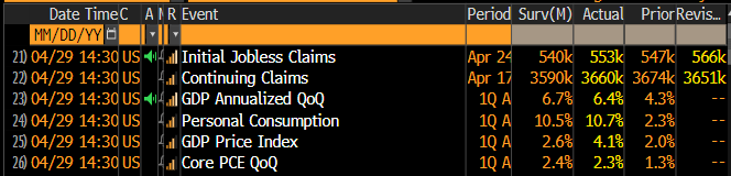 Wzrost PKB w USA za I kwartał wypada wysoko, choć niżej niż oczekiwania Bloomberga. Niemniej wiele konsensusów znajdowało się poniżej konsensusu Bloomberga, który wzrósł w ostatnim czasie ze względu na dobre publikacje z I kwartału. Zaskakuje jednak konsumpcja, która rośnie w Q1 aż o 10,7% w tempie annualizowanym. Oczywiście tak genialne wyniki konsumpcji to efekt czeków Bidena oraz otwierania gospodarki, co wpływa na zwiększenie zatrudnienia. Warto zauważyć, że dane w USA podawane są właśnie w taki sposób.