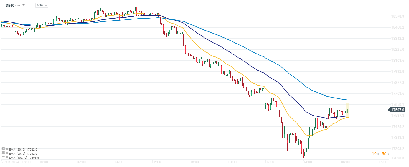 Mocniejszą reakcję widać na notowaniach kontraktów na niemiecki indeks DAX. DE40 wzrósł o 0,4% po odczycie danych makroekonomicznych.