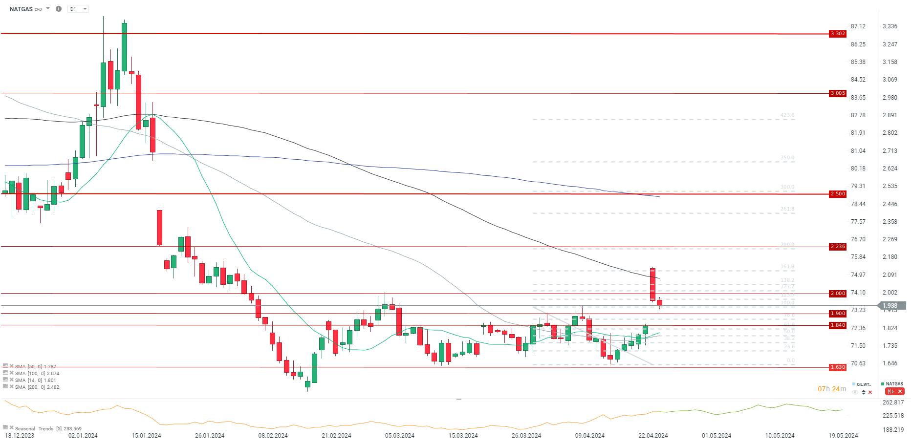 Spadek cen gazu po wczorajszym rolowaniu jest kontynuowany. Pomimo tego, że produkcja spadła ostatnio, to jednak bardzo niski popyt powoduje mocny przyrost zapasów. Źródło: xStation5