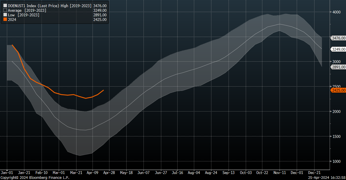 Wzrost jest zgodny z sezonowością (nie jest to największy wzrost w ostatnich 5 latach), ale ogólnie poziom zapasów jak na ten okres roku jest najwyższy przynajmniej od 5 lat.