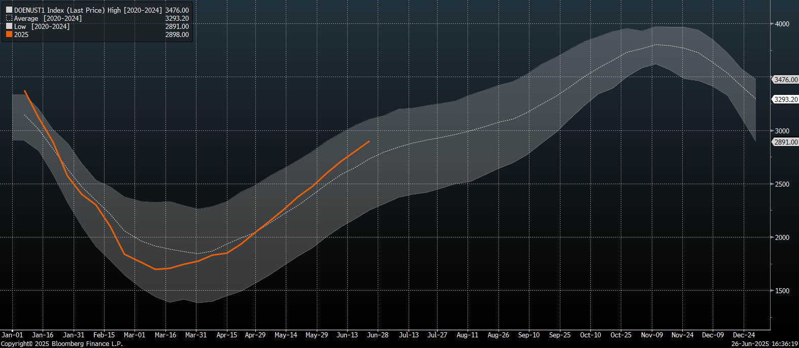Zapasy gazu wzrosły o 96 mld stóp sześciennych mimo oczekiwań prognozujących niewielkie spowolnienie tempa wzrostu. Od początku maja zapasy pozostają powyżej średnich za ostatnie pięć lat i różnica między zapasami a średnią zaczyna się pogłębiać.
