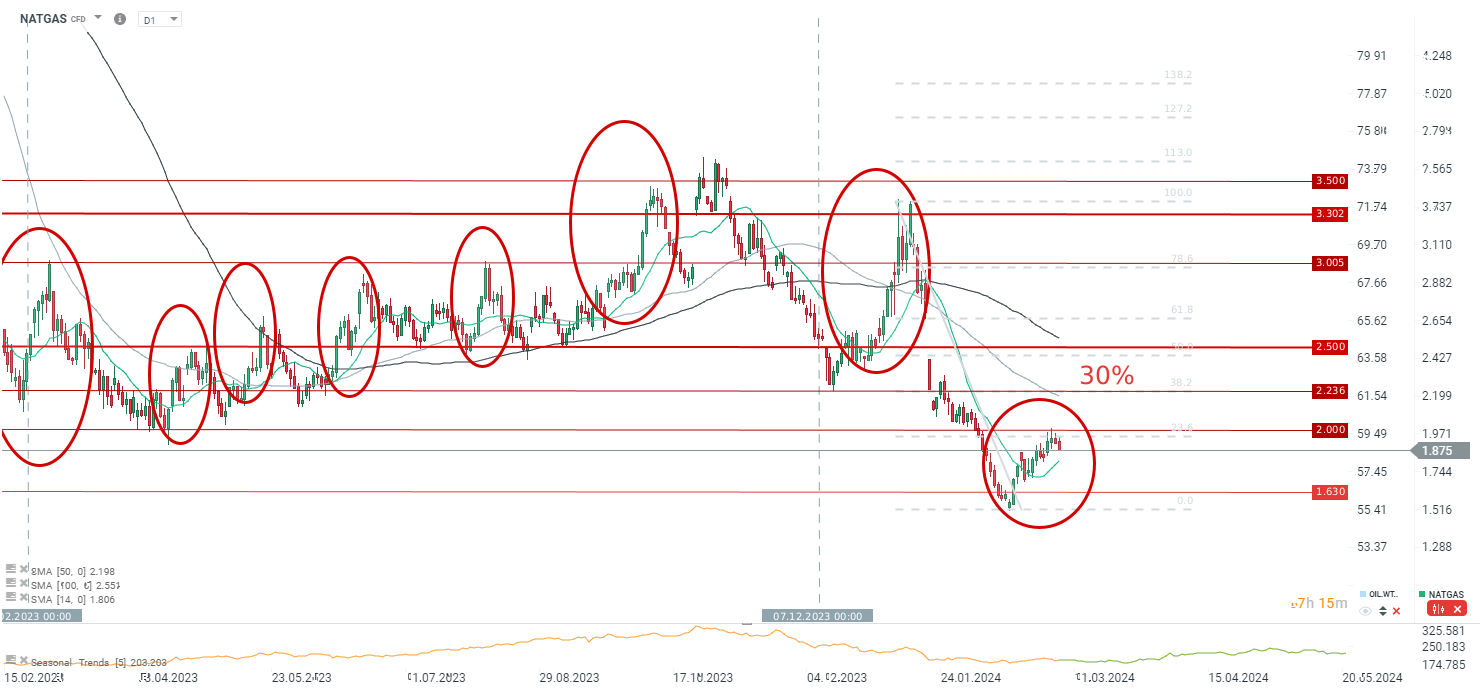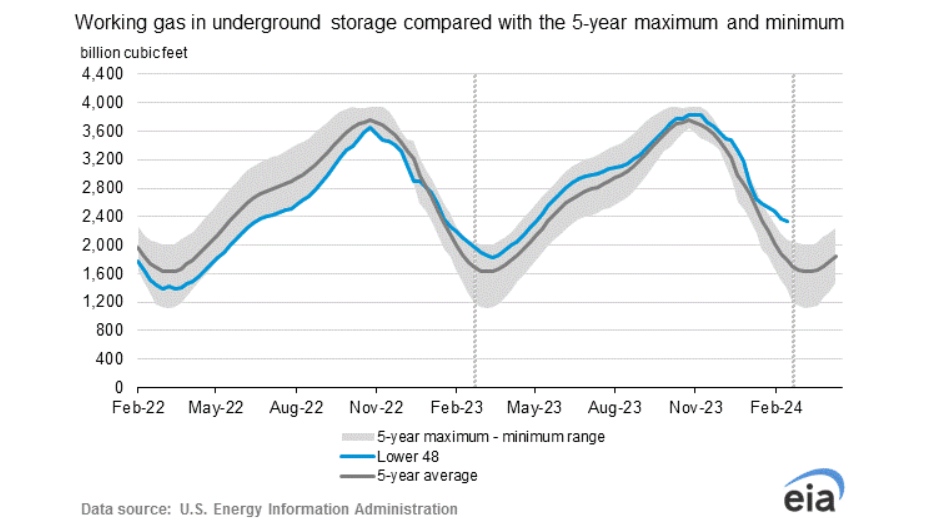 Spadek zapasów gazu wypada mniej więcej z oczekiwaniami na poziomie -40 bcf, przy oczekiwaniu -37 bcf. Poprzednio było to 96 bcf. Pogoda jest cały czas bardzo dobra w USA i w początkowych dniach marca mieliśmy mniejszy pobór gazu niż podaż. Na poniższym wykresie widać, że nadwyżka za obecny okres jest największa od 5 lat. Cena wyraźnie traci po dzisiejszym raporcie i reaguje wyraźnie na okolice oporu przy 2,0 USD/MMBTU.