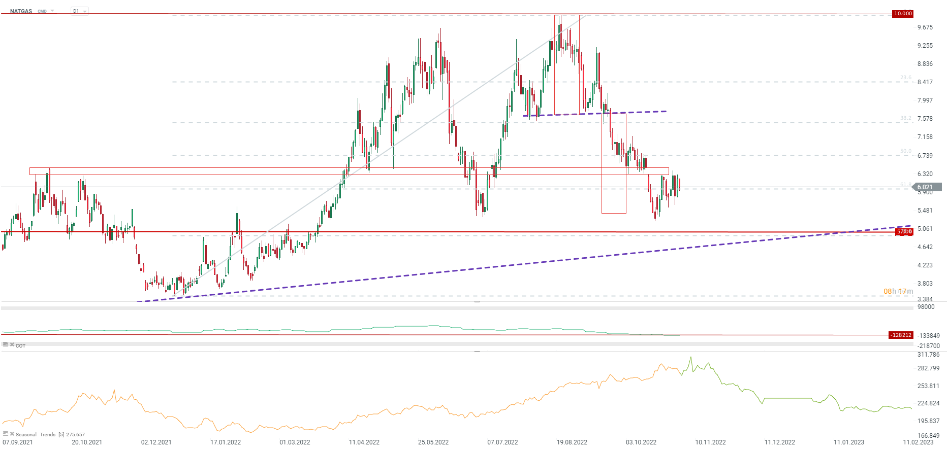 Gaz nie przebija się przez ważną strefę oporu w okolicach 6,3 USD/MMBTU. Źródło: xStation5