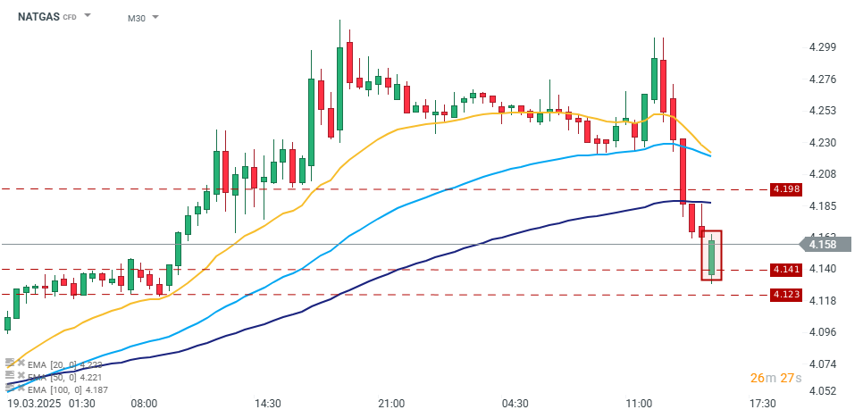 W pierwszej reakcji na dane na rynku kontraktów na gaz cena kontynuowała dynamiczny spadek, trwający od ok. 13:00. Jednak po ruchu spadkowym widzimy odbicie się od wsparcia i tendencje domykającą lukę cenową.