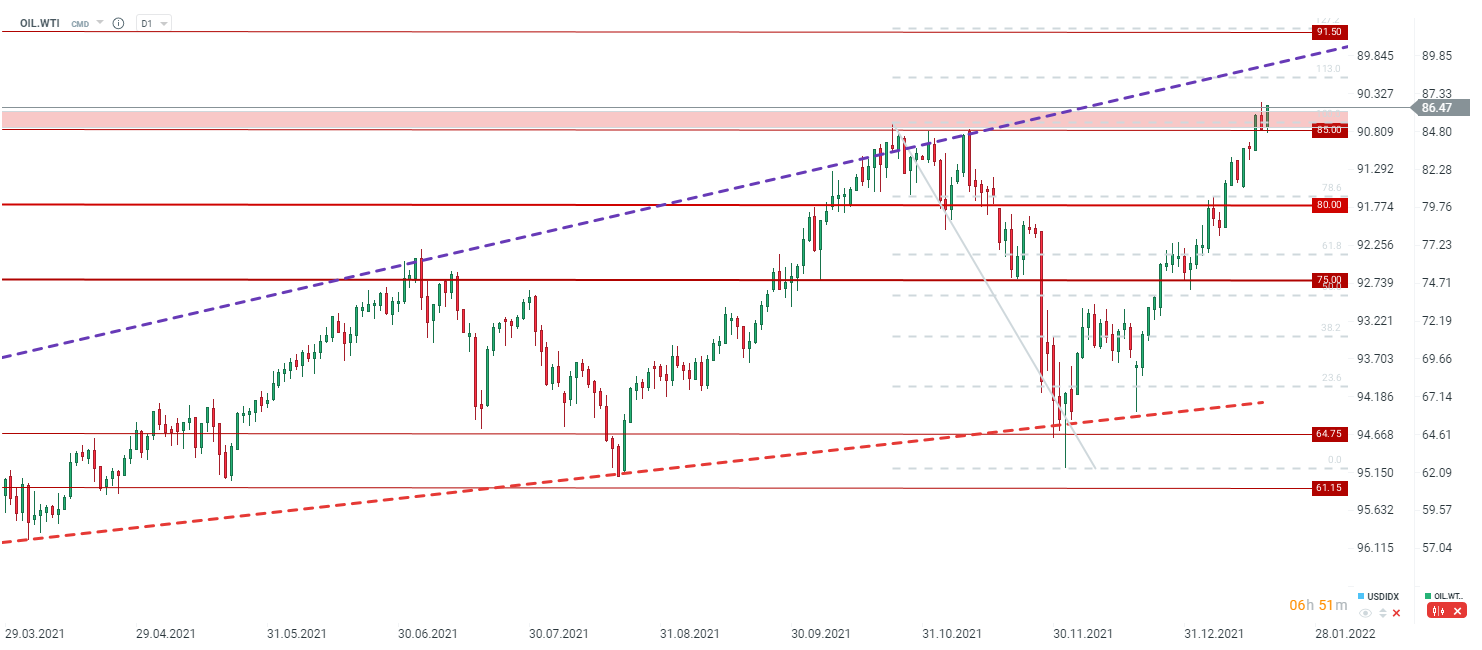 Ropa jednak absolutnie nie zwraca na te dane uwagi. Kontynuowane jest odbicie po wczorajszej lekkiej korekcie. Warto zauważyć, że ropa WTI porusza się w rozszerzającym się linie, co może być sygnałem ostrzeżenia dla byków. Źródło: xStation5