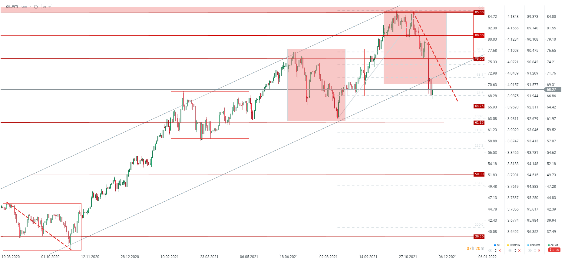 Ropa nie reaguje jednak na dzisiejszy raport DOE. Niemniej odbicie, które było napędzone nadzieją na utrzymanie produkcji bez zmian ze strony OPEC+ zostało wyraźnie ograniczone. Źródło: xStation5
