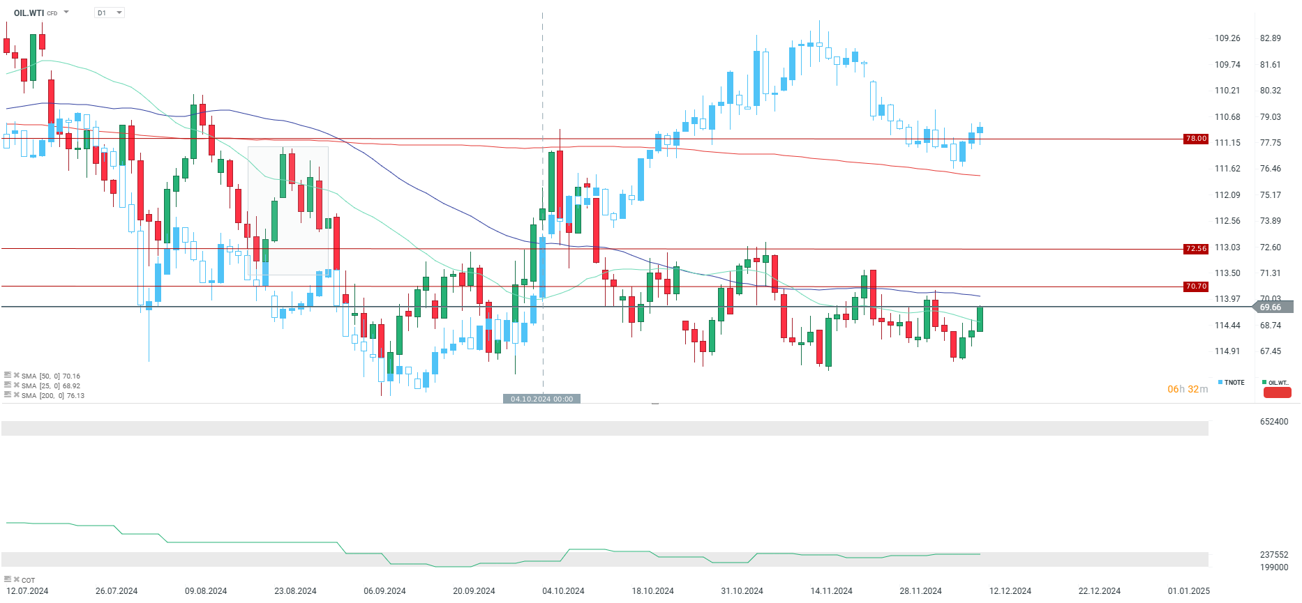 Ropa zyskuje dzisiaj trzeci dzień z rzędu, co jest związane z nadzieją na chińską stymulację oraz oczekiwaniem deficytu na rynku w I kwartale przyszłego roku po ostatnim ruchu ze strony OPEC+. Ropa zbliża się do poziomu 70 USD i jednocześnei znajduje się w strefie podażowej między średnimi 25 i 50 sesyjnymi.