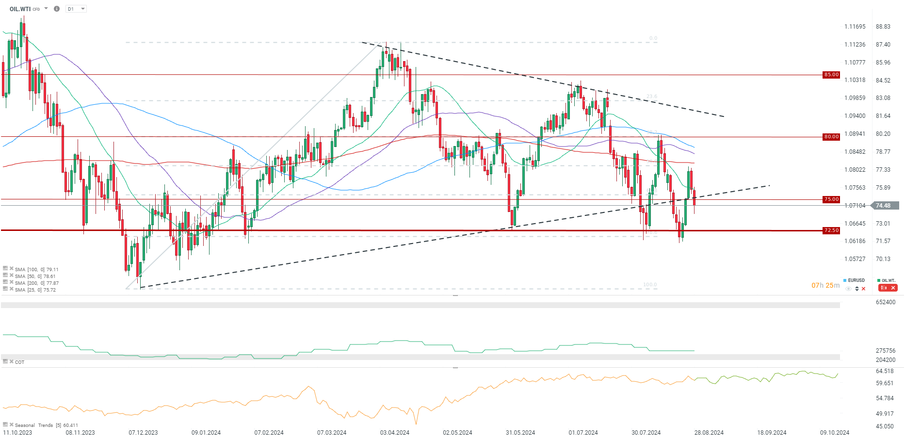 Spada nieco implikowany popyt na ropę, ale wciąż popyt na benzynę wygląda mocno. Mimo wszystko mamy spore rozczarowanie pod względem zmiany zapasów ropy. Ceny ropy spadają dzisiaj mocno w ciągu dnia, WTI traci 1,7%. Ropa po publikacji próbuje minimalnie rosnąć, ale są to na razie ograniczone próby.