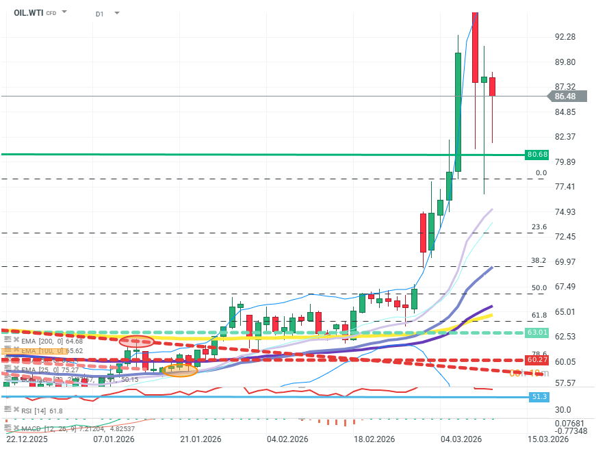 Amerykański rynek produktów ropopochodnych wskazuje na wyraźne niedobory mocy rafineryjnych. Zapasy ropy rosną kolejny odczyt z rzędu, i to znacznie powyżej oczekiwań. Zapasy benzyny natomiast spadają, a w odpowiedzi na ten niedobór rośnie stopień wykorzystania rafinerii oraz produkcja benzyny. Zaobserwować można też umiarkowany, lecz widoczny wzrost importu, prawdopodobnie o charakterze zapobiegawczym w świetle konfliktu w Cieśninie Ormuz.