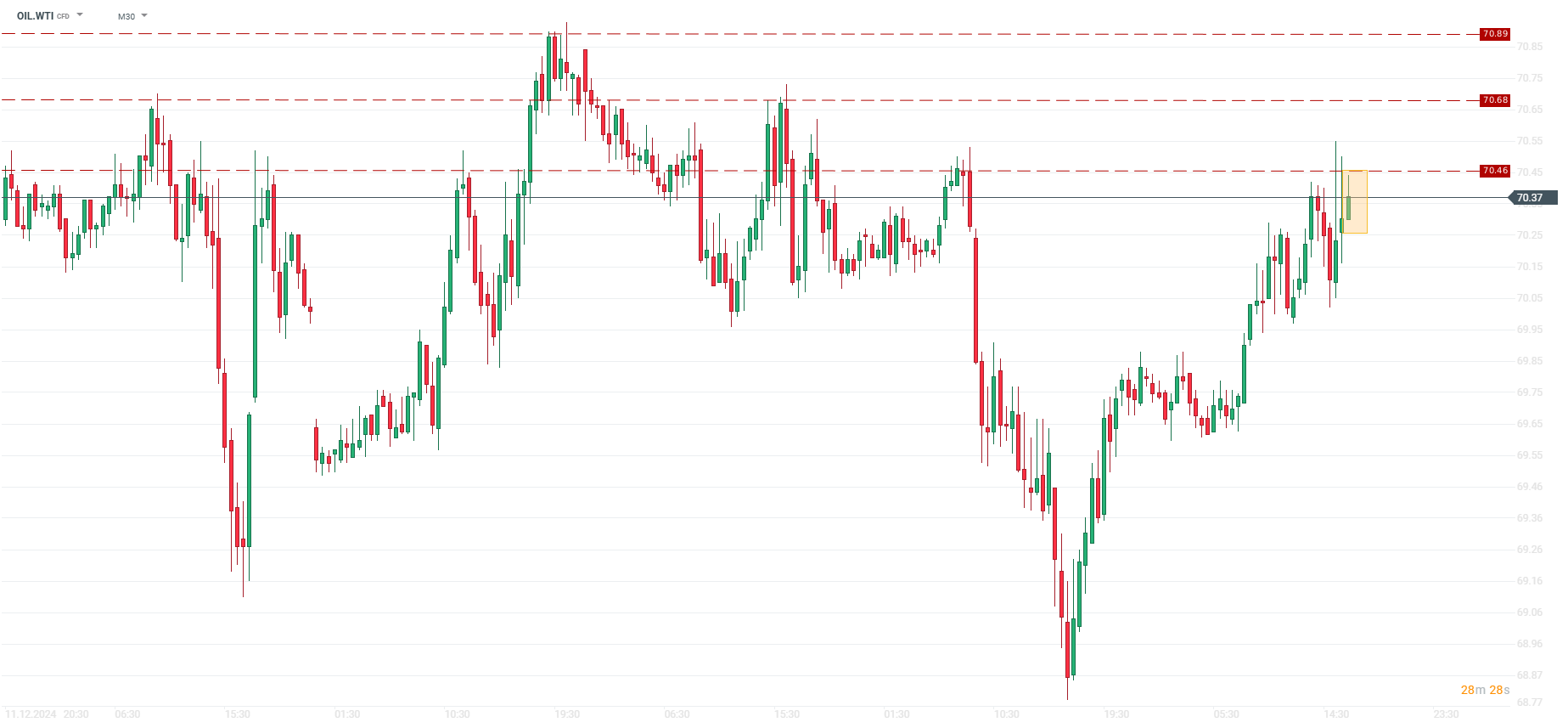 Kontrakty na ropę WTI zareagowały podtrzymaniem ruchu wzrostowego, jaki widzimy na wykresie w interwale 30 minutowym. Cena zbliża się do poziomu 70,46 $, wyznaczonego przez dzisiejsze szczyty.