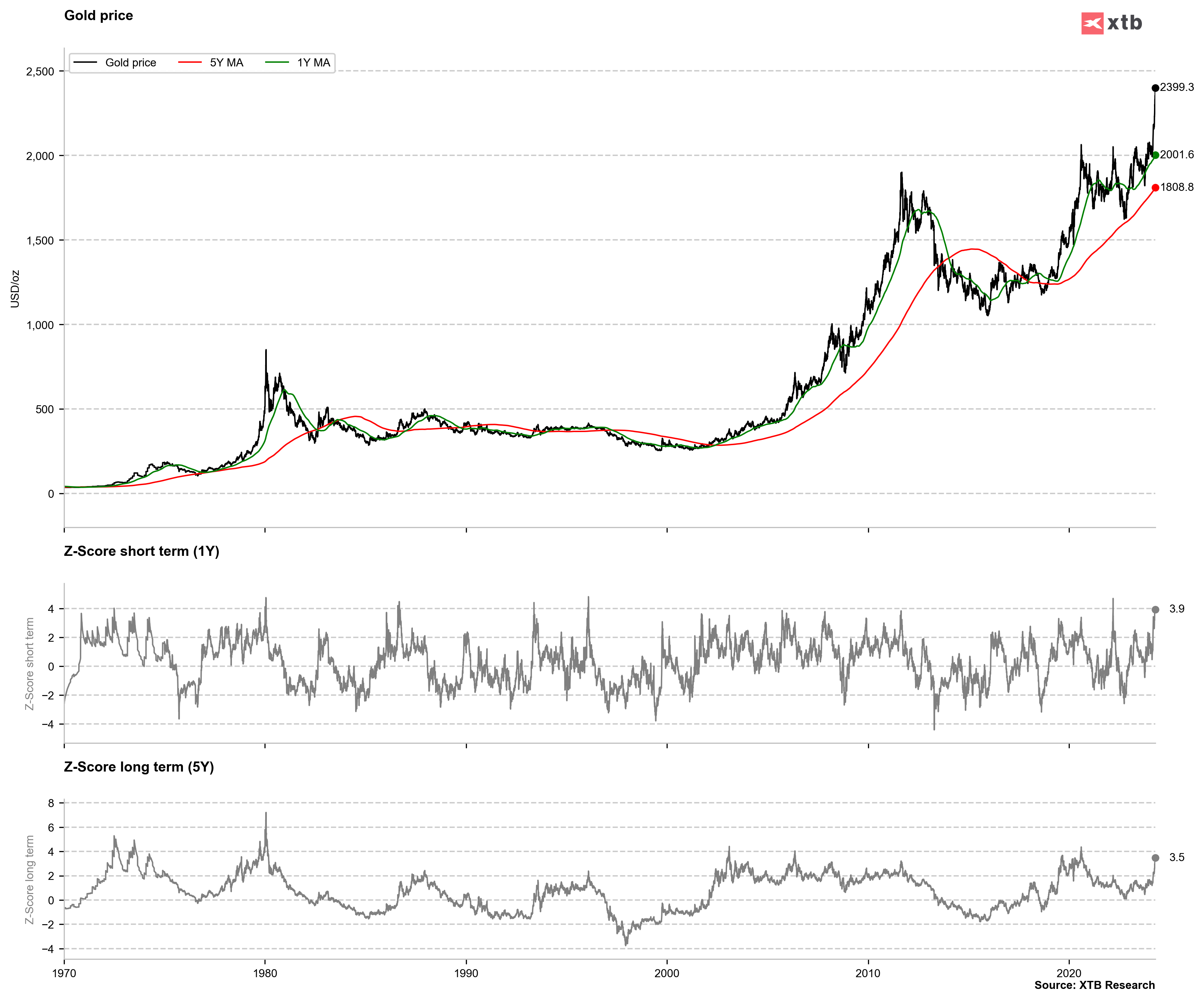 Warto zauważyć, że złoto wydaje się coraz bardziej wykupione względem 1 rocznej i 5 letniej średniej. W przeszłóści w momencie przekroczenia 4 krotnego odchylenia standardowego od 1 rocznej średniej obserwowaliśmy mniejsze korekty. Z kolei nieco większe ruchy spadkowe miały miejsce po przekroczeniu 4 krotnego odchylenia standardowego od 5 letniej średniej. Te sytuacje miały miejsce rzadziej, ale gwałtowne spadki miały miejsce dopiero wtedy, gdy wartość odchylenia przekraczała znacząco 4 krotność.
