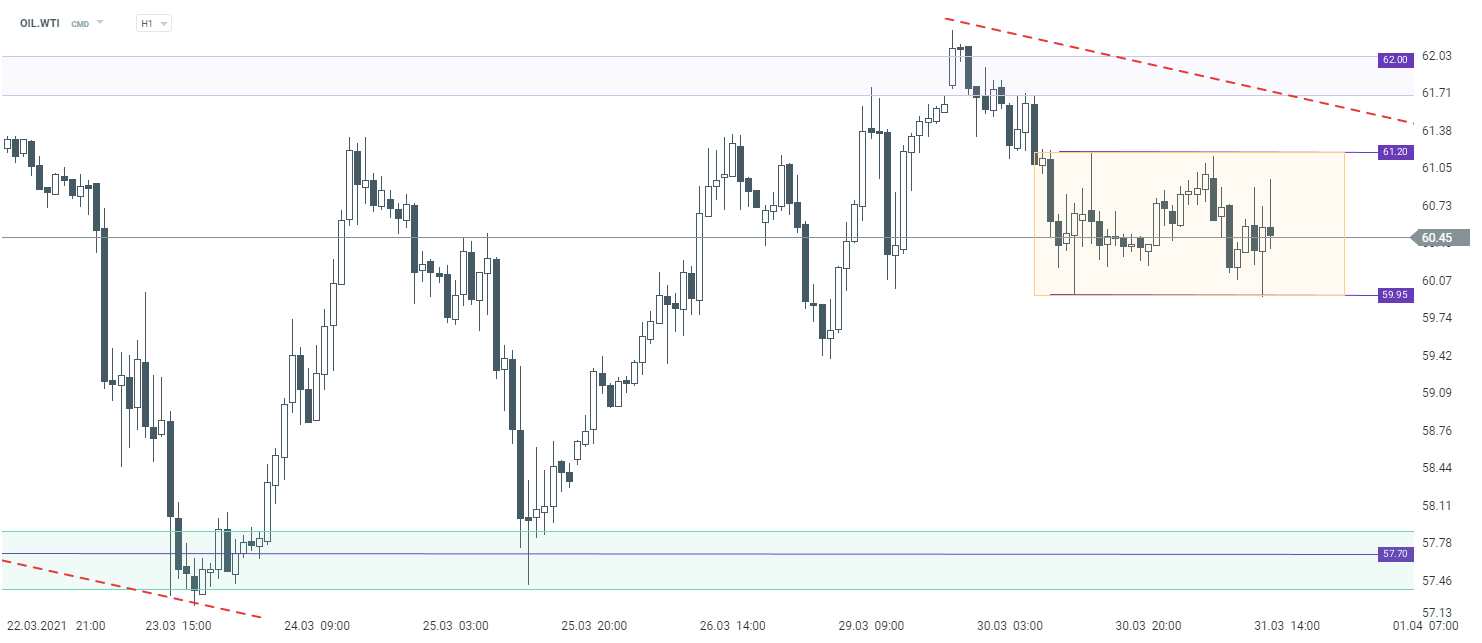 Przed chwilą poznaliśmy dane Departamentu Energii Stanów Zjednoczonych o zaspach ropy naftowej. Stany magazynowe "czarnego złota" skurczyły się 0,9 mln baryłek, czyli dokładnie tyle ile wynosiły szacunki rynkowe (poprzednio +1,9 mln brk). W przypadku benzyny odnotowano z kolei nieoczekiwany spadek o 1,7 mln brk, podczas gdy spodziewano się wzrostu o 0,4 mln brk (poprzednio +0,2 mln brk). Natomiast stany magazynowe destylatów zwiększyły się o 2,5 mln brk, podczas gdy szacowano wzrost o 0,8 mln brk. (poprzednio +3,8 mln brk). Dane nie przełożyły się na większą zmienność na rynku ropy naftowej. Patrząc technicznie na wykres ropy WTI, notowania utknęły w lokalnej konsolidacji pomiędzy 59,95$, a 61,2$. Wydaje się więc, że najlepiej jest zaczekać na wybicie w jedną ze stron.