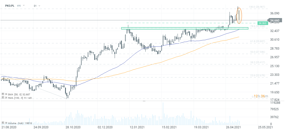 Kurs PKO.PL odrobił wczoraj straty wywołane krachem z lutego-marca 2020. Dzisiejsze spadki zatrzymały się na poziomie 34,060 i obecnie kupujący próbują odrabiać część strat. Gdyby jednak miało dojść do ponownej fali spadkowej, jako wsparcie można będzie uznać strefę w okolicach 33 zł (szczyty ze stycznia 2021 oraz konsolidacja z ostatnich tygodni) - strefa zbiega się ze zniesieniem 78,6% pandemicznej fali spadkowej z początku 2020 roku. Źródło: xStation5