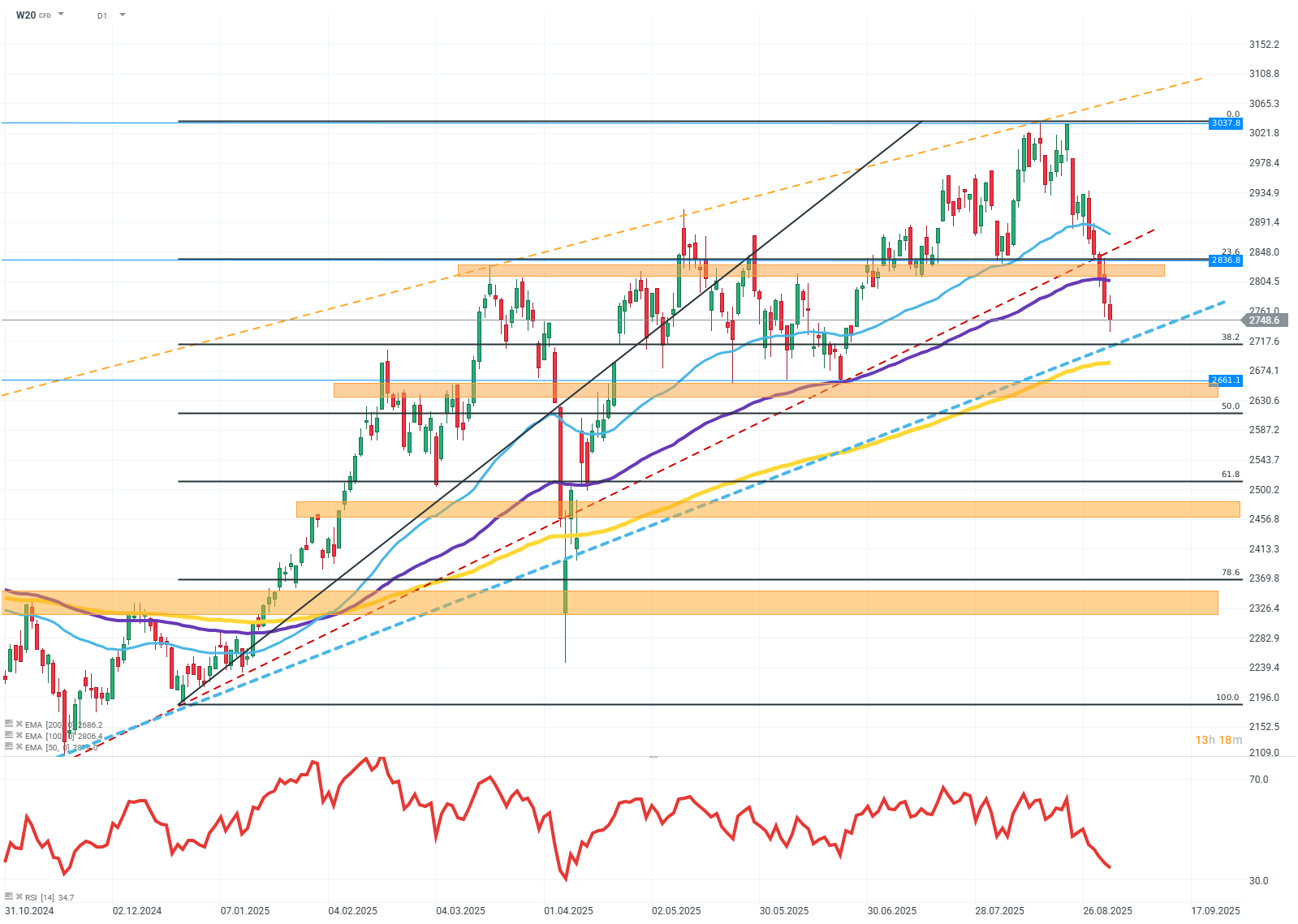 Obecnie sytuacja na wykresie wygląda dość dramatycznie dla kupujących. Cena przełamała opory na średnich EMA25, EMA50 oraz średnioterminowej linii trendu wzrostowego, praktycznie bez żadnych korekt w trendzie spadkowym, co sygnalizuje wyraźną słabość kupujących. Obecnie kurs zbliża się do ważnego wsparcia - kolejnej linii trendu, dodatkowo wzmocnionej średnią EMA200 oraz poziomem Fibonacciego 38,2. Jeśli kupującym nie uda się obronić tego poziomu, możliwe są dalsze spadki w kierunku Fibonacciego 50 oraz lokalnych dołków/szczytów na psychologicznym poziomie 2500, gdzie również znajduje się poziom Fibonacciego 61,8. Korekcie wzrostowej w krótkoterminowym trendzie spadkowym może sprzyjać bardzo wyprzedany RSI.