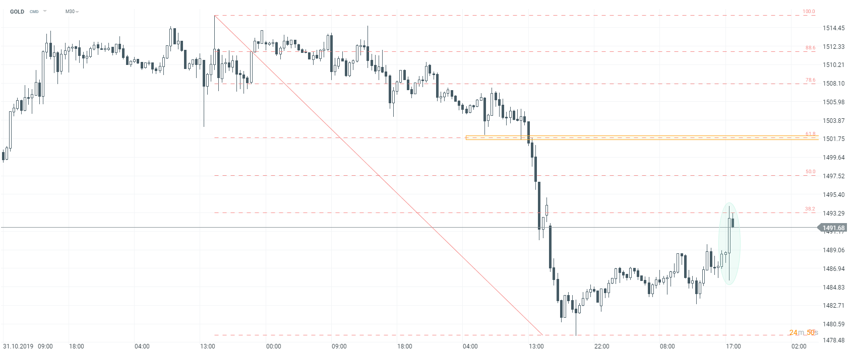 Informacje te przełożyły się na spadki indeksów giełdowych oraz wzrosty na rynku metali szlachetnych. Reakcja była jednak chwilowa, aktualnie ruch został w znaczący sposób skorygowany.