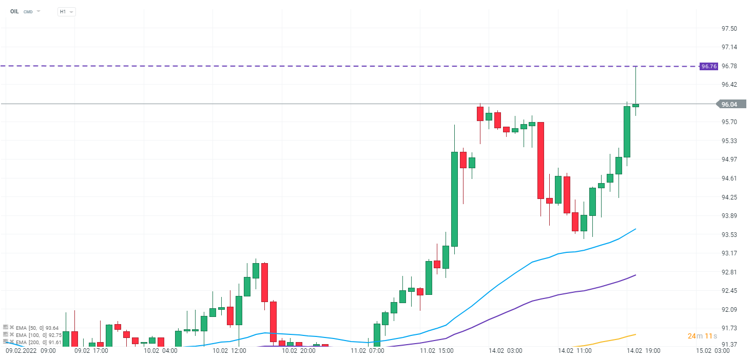 Ropa skokowo umocniła się po informacjach Prezydenta Ukrainy oraz relokacji wojsk rosyjskich w tryb bojowy. "Czarne złoto" sięgnęło 96,76 USD za baryłkę. Źródło: xStation 5