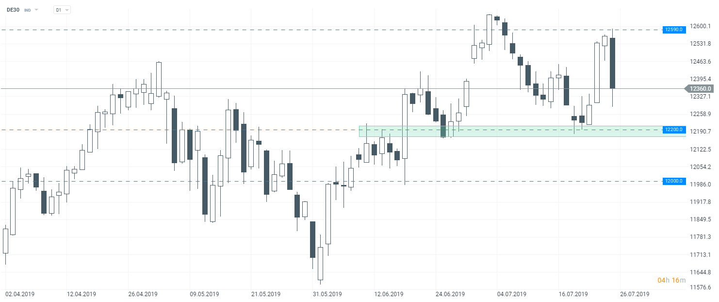 Najważniejszym wydarzeniem dzisiejszej sesji było z pewnością posiedzenie EBC. Europejski Bank Centralny zgodnie z oczekiwaniami nie zdecydował się na zmianę stóp procentowych. Rada Prezesów zapowiedziała jednak wprowadzenie we wrześniu pakietu działań, który ma pobudzić dynamikę inflacji. Po ostatnich gorszych danych makroekonomicznych, inwestorzy oczekiwali, że nawet podczas dzisiejszego spotkania może dojść do podjęcia pewnych kroków. W swoim wystąpieniu prezes EBC wyraźnie podkreślił, że EBC jest gotowy do użycia wszelkich dostępnych instrumentów, które mają doprowadzić do stymulacji dynamiki cen. Podczas czwartkowej sesji mogliśmy obserwować podwyższoną zmienność nie tylko na parach walutowych z euro, ale także na europejskim rynku akcji.