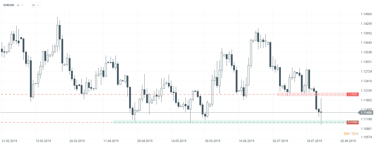 Jeśli chodzi o kurs euro do dolara, to spoglądając na interwał D1, można wywnioskować , że rynek jest niezdecydowany co do dalszego kierunku. Podczas dzisiejszej sesji mogliśmy obserwować zejście na najniższe poziomy w 2019 roku, niemniej kurs znajdował się tam bardzo krótko, po czym cena dynamicznie odbiła. Wzrosty nie zdołały jednak pokonać strefy oporowej przy 1,1200, co doprowadziło do kolejnej fali spadkowej po godzinie 16:00. Aktualnie kurs EURUSD znajduje się w okolicach ceny otwarcia.